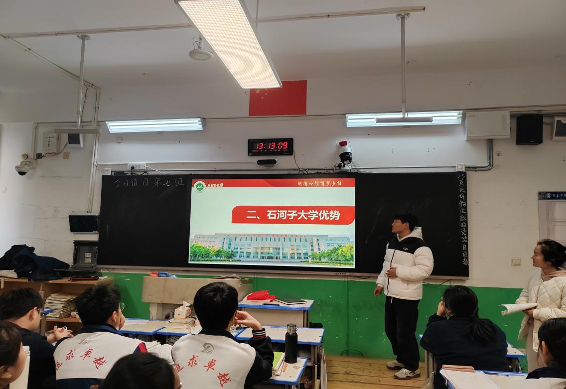 入班宣讲环节,面对距高考百日的高三学子,团队以PPT梳理石河子大学七十余载办学历史——从1949年进军新疆途中创建的卫生学校,到今日国家“双一流”建设高校,一代代石大人将理想种进边疆。团队详细解读招生政策与就业前景,以自身经历告诉学弟学妹:选择石河子大学,就是选择与兵团精神同行,在服务国家战略中书写人生华章。
